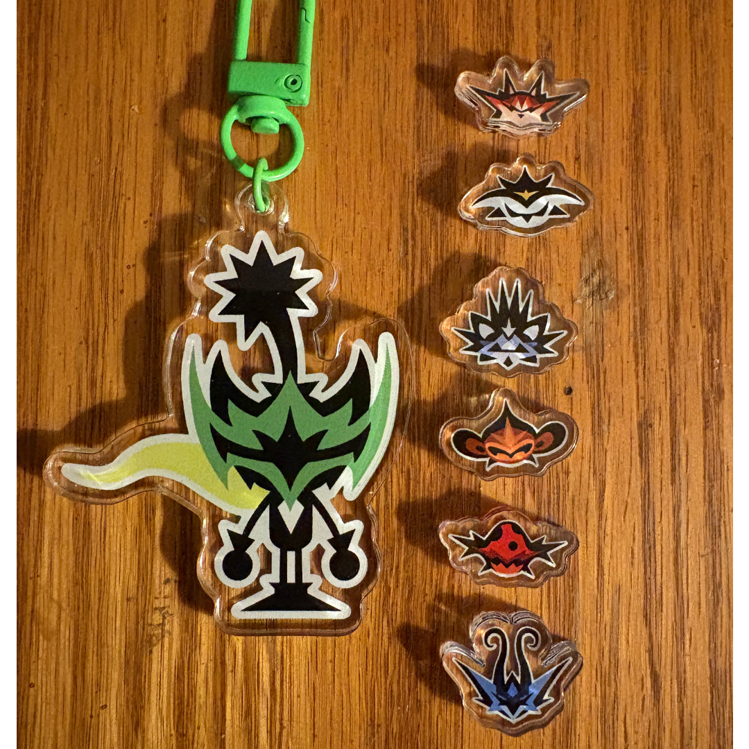 A 3mm thick Acrylic Shaker Charm inspired by the Arrow-Class Uber-hero from the 3rd Installment of a Drum-Based rhythm game on the PSP. The charm comes with a Green U-Style Spring Hook. The Head of the Hero acts as the case and the Different Special Class Masks as the Shaker Inserts. The back features a unique design containing a reference to the Arrow Weapon. This is one of three shakers in the Uber-hero collection.