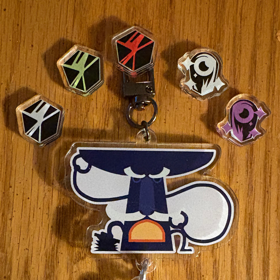 A 3mm Laser-Cut Acrylic Shaker Charm based on the Forge Dancing Minigame from the Drum-Based Rhythm PSP game. This shaker charm features 5 acrylic chips of the drop items you would receive in the game upon completion and one Villager Head Chip. The back features a unique design containing a reference to the Helper Character - The Tireless Blacksmith. This is one of several shakers in the Minigame collection.
