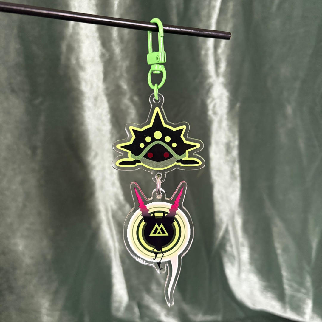 A 3mm thick Acrylic Charm set inspired by the Green Archvillain from the third installation of the Drum-Based Rhythm game on the PSP. The set comes with 2 charms - a mask charm and a spirit charm, which can be ordered independently or as a set of two connected by a Jump Ring. The Mask Charm measures 50mm (2in) wide and 48mm (1.9in) tall, while the Spirit Charm measures 39mm (1.5in) wide and 74mm (2.9in) tall. The charm comes with a Green U-Style Spring Hook and can be Bundled with the other Archvillain Charm on the specific “Archfiend Villain” Bundle Item Listing.