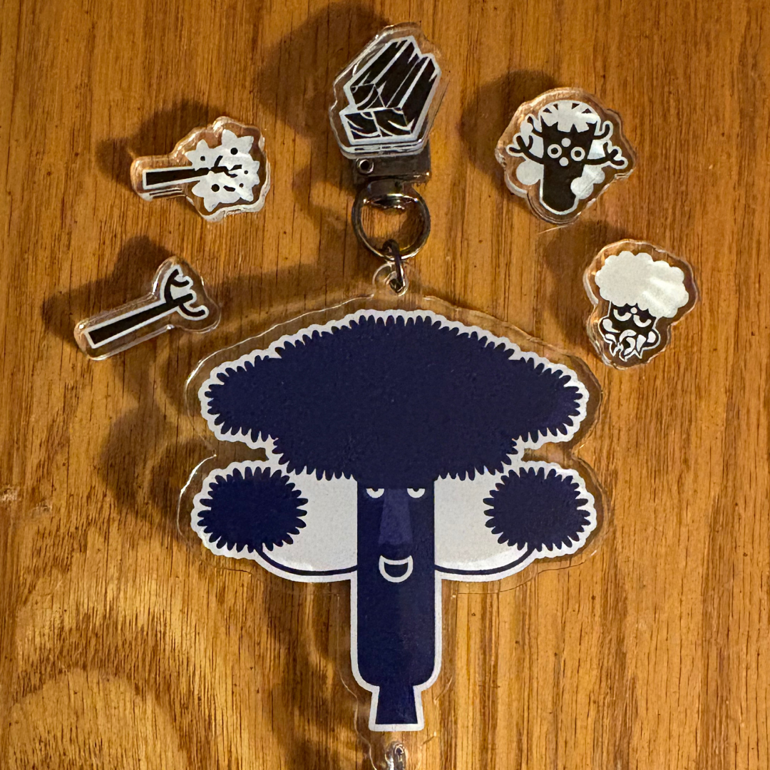 A 3mm Laser-Cut Acrylic Shaker Charm based on the Tree Dancing Minigame from the Drum-Based Rhythm PSP game. This shaker charm features 5 acrylic chips of the drop items you would receive in the game upon completion and one Villager Head Chip. The back features a unique design containing a reference to the Helper Character - The Intrepid Trumpeter. This is one of several shakers in the Minigame collection.
