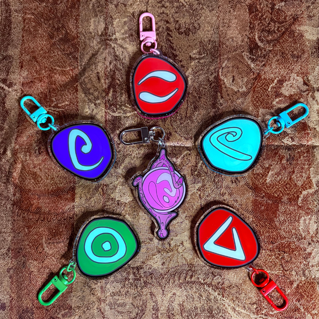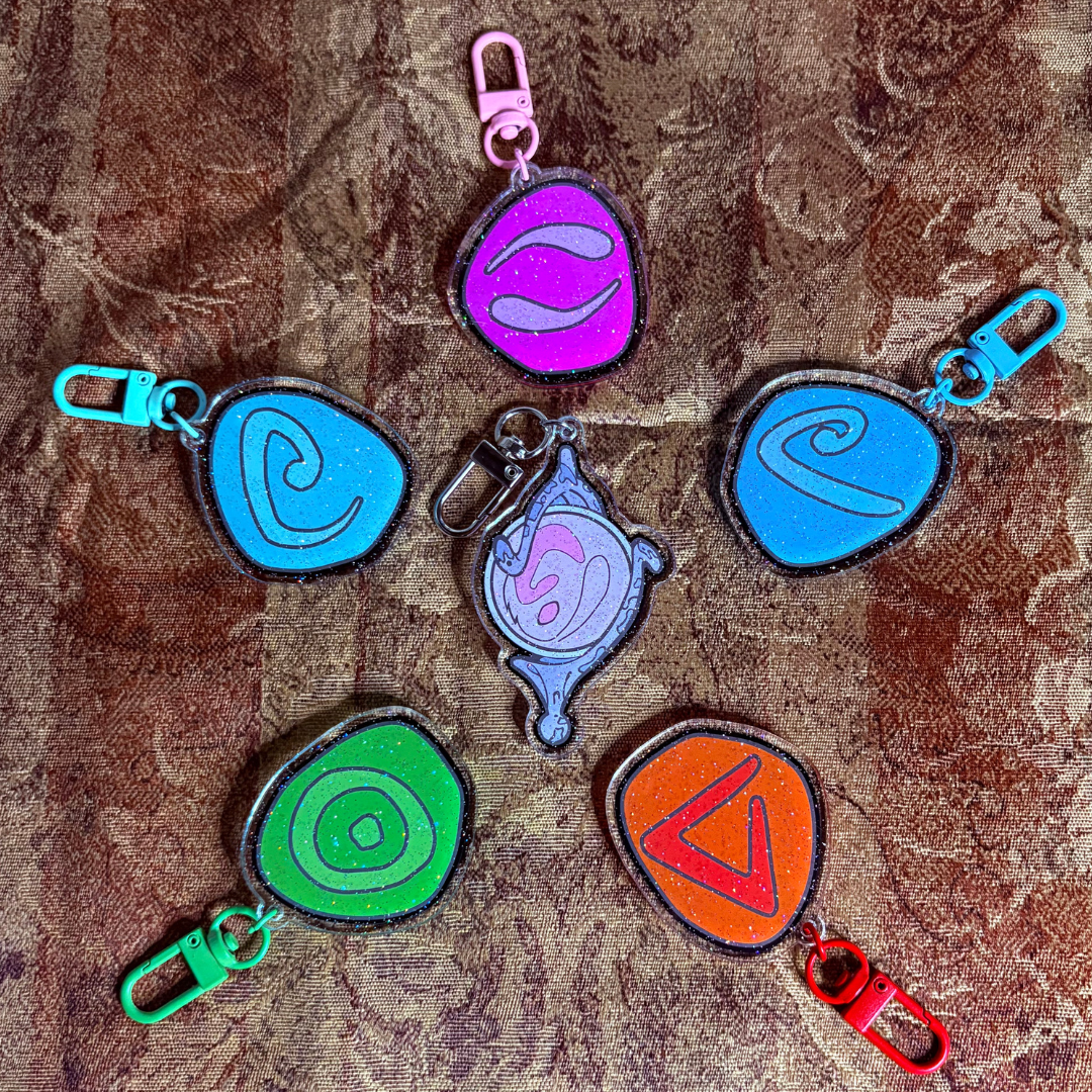 A set of 3mm thick Acrylic Charms inspired by the Elemental Guardian Symbols and Amulets. The Symbol Charms have a consistent height of 55mm (2.15in) with varying widths that can be seen on the measurement cards, and the amulet measurements are 65mm (2.5in) tall and roughly 46 (1.8in) wide. The charms are all double-sided design with the different color schemes on each side. The charms comes with U-Style Spring Hooks that coincide with the main color of the charm and a Glitter Finish on the Back. Check each of the bundle options to show the progressive discounts to be had when you order more.