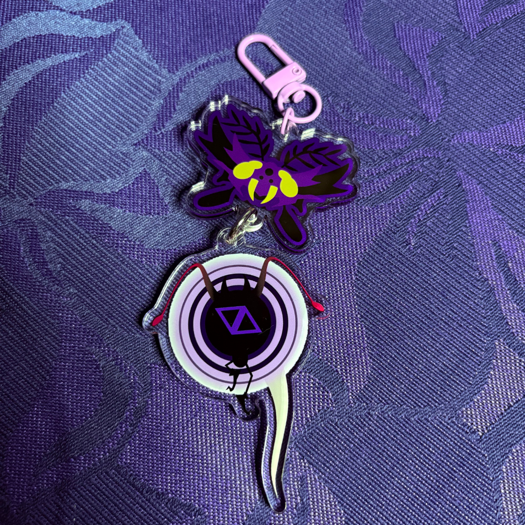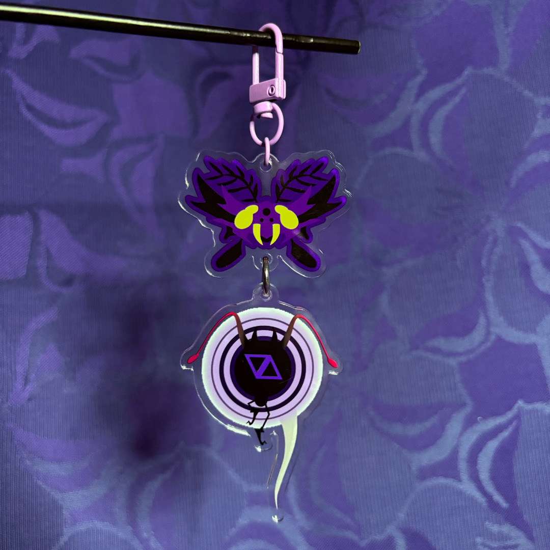 A 3mm thick Acrylic Charm set inspired by the Violet Archvillain from the third installation of the Drum-Based Rhythm game on the PSP. The set comes with 2 charms - a mask charm and a spirit charm, which can be ordered independently or as a set of two connected by a Jump Ring. The Mask Charm measures 50mm (2in) wide and 37mm (1.45in) tall, while the Spirit Charm measures 48mm (1.9in) wide and 70mm (2.75in) tall. The charm comes with a Purple U-Style Spring Hook and can be Bundled with the other Archvillain Charm on the specific “Archfiend Villain” Bundle Item Listing.