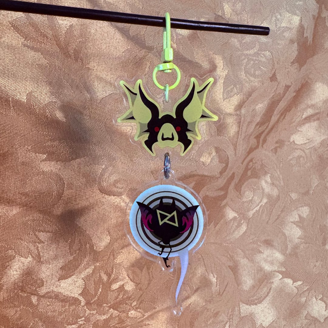 A 3mm thick Acrylic Charm set inspired by the Yellow Archvillain from the third installation of the Drum-Based Rhythm game on the PSP. The set comes with 2 charms - a mask charm and a spirit charm, which can be ordered independently or as a set of two connected by a Jump Ring. The Mask Charm measures 50mm (2in) wide and 40mm (1.6in) tall, while the Spirit Charm measures 39mm (1.5in) wide and 70mm (2.75in) tall. The charm comes with a Yellow U-Style Spring Hook and can be Bundled with the other Archvillain Charm on the specific “Archfiend Villain” Bundle Item Listing.